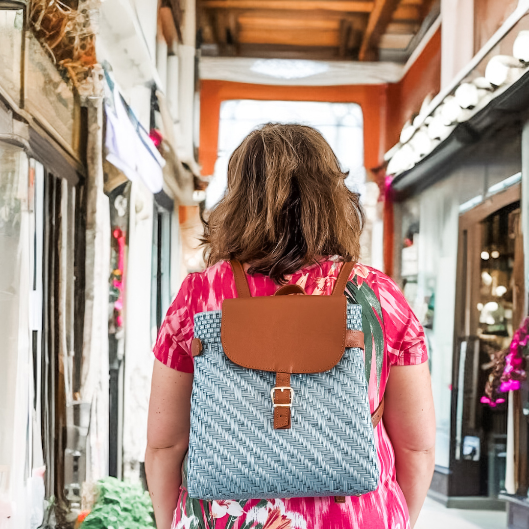 Durable, eco-friendly, and artisan-made — our Bagaro Backpack blends style with function. Handwoven in Mexico from 100% recycled plastic with leather straps and trim, it features a secure buckle closure, adjustable straps, and a lined interior with a zipper pocket for organization.