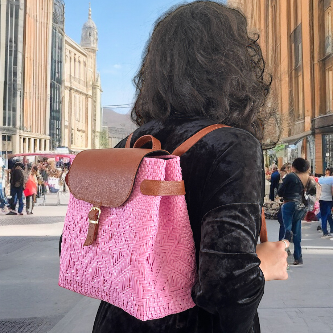 Durable, eco-friendly, and artisan-made — our Bagaro Backpack blends style with function. Handwoven in Mexico from 100% recycled plastic with leather straps and trim, it features a secure buckle closure, adjustable straps, and a lined interior with a zipper pocket for organization.