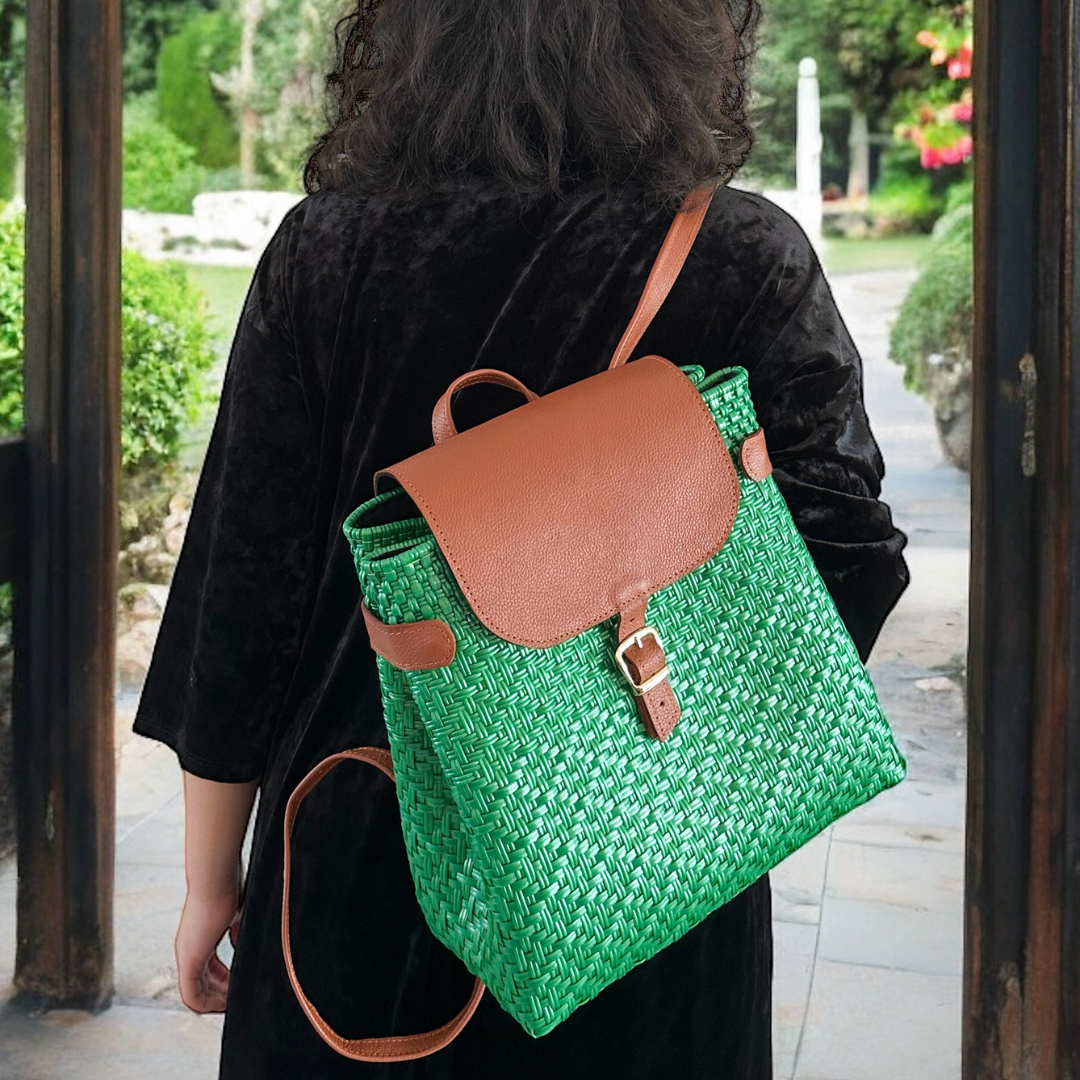 Durable, eco-friendly, and artisan-made — our Bagaro Backpack blends style with function. Handwoven in Mexico from 100% recycled plastic with leather straps and trim, it features a secure buckle closure, adjustable straps, and a lined interior with a zipper pocket for organization.